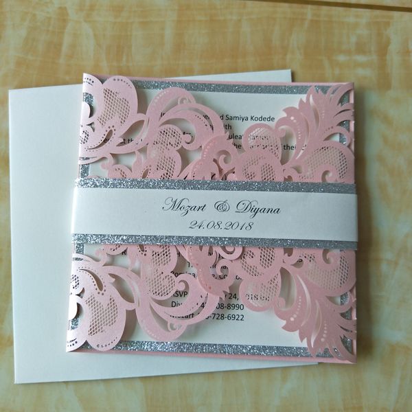 Details About Set Diy 50 100 Laser Cut Invitations Belly Band Light Grey Glitter Pocket Fold